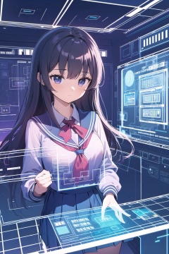 (masterpiece), 1girl, school uniform, classroom, (holographic interface:1.4),