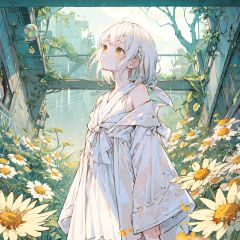 yellow theme,the setting sun,(((Chamomile))),Chamomile,cornflower,vines,forest,ruins,lens flare,hdr,Tyndall effect,damp,wet,1girl,bare shoulders,broken glass,broken wall,white hair,white dress,closed mouth,constel lation,flat color,braid,blinking,white robe,float,closed mouth,constel lation,flat color,looking up,standing,medium hair,standing,solo,