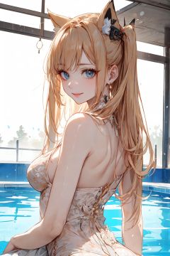 (style:1.1), 1 sexual girl, a bump figure, Big eyes, thick eyelashes, Sitting by the pool, hand dragging head, seen from below, semi transparent, very detailed background, sharp focus, volume fog, opening breasts, very slim, breasts medium, Shoot from the side, buttocks focus, (tight body dress), A slender waist, Lust outflows, Head up, Side lens, shidudou, A charming smile, Fox eye, There's a mole right now, (Upper body:1.3), From below