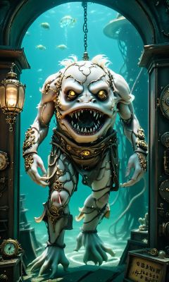((masterpiece)),((best quality)),8k,high detailed,ultra-detailed,intricate detail,Photography,headless,bare shoulders,((xingtian)),xingtian , in a submerged steampunk city and exploring the underwater world, <lora:xigntian:1>,