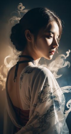 Double Exposure Style, Volumetric Lighting, a girl with Wrap top,arching her back,Traditional Attire,Artistic Calligraphy and Ink,, light depth, dramatic atmospheric lighting, Volumetric Lighting, double image ghost effect, image combination, double exposure style,FilmGirl