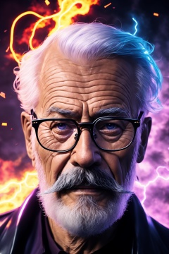 lightning strikes, abstract, high quality, UHD, Luminous Studio graphics engine, violet, cyan, octane render, cloudy haze, fiery members, old man Carl Gustav Jung with glasses and mustache portrait