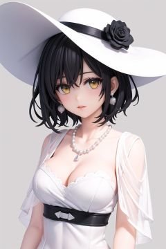 1girl,  hat,  solo,  black flower,  yellow eyes,  sun hat,  breasts,  jewelry,  black rose,  flower,  necklace,  dress,  black hair,  looking at viewer,  cleavage,  black headwear,  makeup,  grey background,  pale skin,  red lips,  lipstick,  short hair,  simple background,  earrings,  pearl necklace,  medium breasts,  mature female,  upper body,  rose