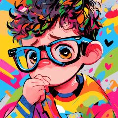 A boy, doodling, colorful,wearing glasses, crying