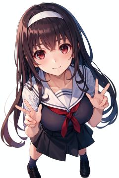 best quality, masterpiece, illustration, ultra-detailed,full body, beautiful detailed eyes, (1girl:1.3),kasumigaoka utaha,high-angle view,  <lora:utaha_lycoris:0.5>,black serafuku, frog pose,white background,  smiling:0.3,
