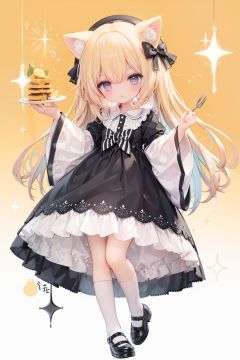 (cinematic lighting),  dreamy atmosphere,  Ray tracing,  (((solo))),  (loli:1.5),  (child:1.5),  (petite:1.5),  green eyes,  (animal ears),  dress,  solo,  food,  blonde hair,  open mouth,  long hair,  pancake,  flower,  holding,  bow,  smile,  fork,  bird,  socks,  looking at viewer,  shoes,  striped background,  holding fork,  bonnet,  striped,  frills,  long sleeves,  :d,  yellow dress,  bangs,  eyebrows visible through hair,  blush,  green nails,  hair bow,  nail polish,  diagonal stripes,  chick,  sparkle,  frilled dress,  orange bow,  fruit,  full body,  :3,  hair between eyes,  green bow,  puffy sleeves,  heart,  lemon,  orange footwear,  animal ear fluff,  white bow,  cat ears,  bobby socks,  orange headwear,  see-through sleeves,  blue background,  striped bow,  hair ornament,  white legwear,  mary janes
