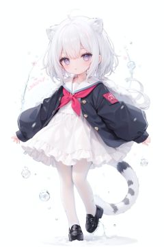 cute,Infant,solo blue shirt,blue sailor coat,loli,full body,white hair,snow leopard ear,white background,pink eyes,laugh,happy,white pantihose,white pantyhose,red armband,