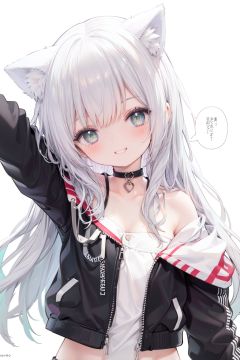 1girl,  solo,  green eyes,  smile,  long hair,  cat ears,  looking at viewer,  animal ears,  white background,  simple background,  bangs,  silver hair,  upper body,  speech bubble,  jacket,  black jacket,  head tilt,  bare shoulders,  eyebrows visible through hair,  off shoulder,  half-closed eyes,  grin,  arm up,  collarbonereflection light