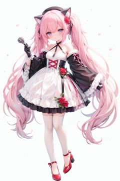 masterpiece, ((best quality)),  dynamic angle, chromatic aberration, ((colorful)),1girl, solo, flower, thighhighs, white thighhighs, gloves, red footwear, long hair, detached sleeves, animal ears, rose, blonde hair, looking at viewer, full body, hat, high heels, petals, dress, standing, twintails, wide sleeves, holding, shoes, frills, red flower, cat ears, bangs, microphone, long sleeves, white flower, hair ornament, white gloves, zettai ryouiki, bare shoulders, pink eyes, frilled dress, small breasts, breasts, closed mouth, skirt, beret, white headwear, very long hair, red eyes, red rose, white dress, blush, ribbon, black gloves, animal ear fluff, hair flower, pink flower
