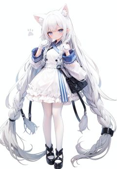 1girl, white_gloves, braid, full_body, gloves, long_hair, official_alternate_costume, pointy_ears, simple_background, solo, standing, very_long_hair, white_background,white hair,blue eyes,paw claw pose, open_mouth,