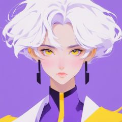yellow and purple, minimalism,  solo,  yellow background,  white hair,  1girl,  looking at viewer,  simple background,  purple eyes,
