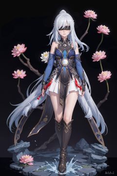 realistic,jingliu, silver hair, elbow gloves, long hair, (blindfold:1.2), boots, bare shoulders, dress, hair ribbon,fancy