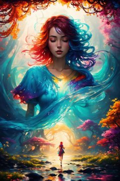 An epic 8K resolution splash art masterpiece, (Immersive splash-style painting:1.3), A surrealistic vision of a woman with flowing red hair and closed eyes, without eye makeup, wearing headphones that transport her to a tropical paradise, (Capturing the flowing allure in every stride:1.3), The composition is framed perfectly, drawing the viewer into a world of dreams and imagination, (An art cover that defies reality:1.3), Created in the style reminiscent of the great artists Greg Rutkowski, Loish, Rhads, Beeple, Makoto Shinkai, Lois van Baarle, Ilya Kuvshinov, Rossdraws, Tom Bagshaw, and Alphonse Mucha, (A masterpiece that stands out on DeviantArt:1.3), The art features a mesmerizing interplay of complementary colors and fantasy concept art elements, (A feast for the eyes with vibrant paint dripping:1.3), The splash-style technique swirls, drips, and melts into a breathtaking contour with intricate details, (A splash screen that sets the tone for the album:1.3), The woman is surrounded by a detailed and intricate environment, beautifully lit with global illumination, (Creating a world that comes to life:1.3)