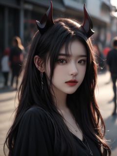 bj_Devil_angel,1girl,long_hair,looking_at_viewer,shirt,black_hair,brown_eyes,jewelry,upper_body,earrings,parted_lips,horns,solo_focus,necklace,blurry,lips,looking_to_the_side,black_shirt,blurry_background,wavy_hair,realistic,red_lips,cinematic lighting,side light,sunshine,strong contrast,high level of detail,Best quality,masterpiece,<lora:FDevil_angel_v3.6:0.7>,