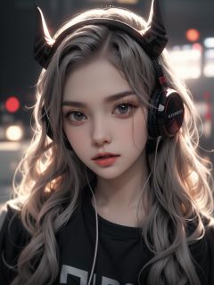 bj_Devil_angel, 1girl, solo, long_hair, looking_at_viewer, shirt, red_eyes, closed_mouth, upper_body, grey_hair, horns, blurry, lips, black_shirt, depth_of_field, blurry_background, headphones, wavy_hair, forehead, headset,cinematic lighting,side light,sunshine,strong contrast,high level of detail,Best quality,masterpiece,<lora:FDevil_angel_v3.6:0.7>,