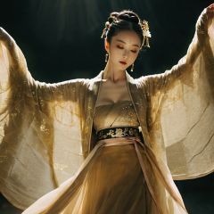 a woman is dancing,hanfu,hair ornament,long sleeves,dress,single hair bun,wide sleeves,<lora:m_06:0.7>,dark,gold,big breasts,black eyes,lips,bouncing breasts,moody lighting,Cinematic Lighting,<lora:shou-xl:0.6>,a graceful dance,amazing light and shadow,wriggling one's body,chinese style palace,full body,