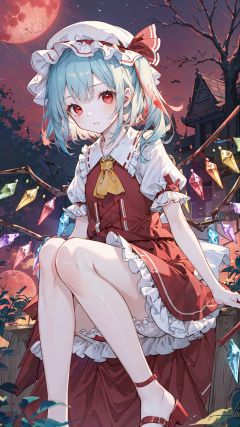 ((((Flandre Scarlet))),Flandre Scarlet (((1 loli))),(((9 years old))), ((little girl)), ribbon,Blue Hair,golden hair,disheveled hair,side-pony,bat wing,DECAYING BAT WINGS,red Dress,red_moon, wings, solo, bloomers, hat_ribbon, barefoot, shower cap,red_eyes, looking_at_viewer,
