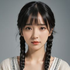 1girl, solo, braid, looking at viewer, black hair, simple background, bangs, closed mouth, realistic, twin braids, black eyes, upper body, mole, blunt bangs, grey background,FilmGirl