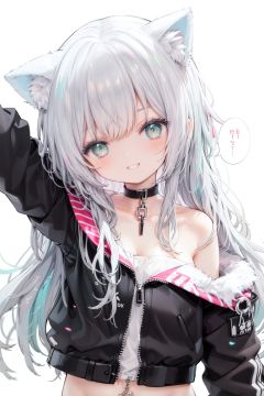 1girl,  solo,  green eyes,  smile,  long hair,  cat ears,  looking at viewer,  animal ears,  white background,  simple background,  bangs,  silver hair,  upper body,  speech bubble,  jacket,  black jacket,  head tilt,  bare shoulders,  eyebrows visible through hair,  off shoulder,  half-closed eyes,  grin,  arm up,  collarbonereflection light