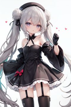 1girl, dress, double bun, hair bun, long hair, black dress, twintails, looking at viewer, smile, hat, bangs, brown hair, white background, solo, open mouth, blush, black headwear, very long hair, garter straps, thighhighs, bare shoulders, beret, :d, ribbon, black gloves, simple background, long sleeves, nail polish, black footwear, red ribbon, bow, gloves, wide sleeves, animal, hair ribbon, boots, red nails, sheath, sheathed, hair between eyes