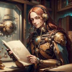 <lora:DaVinciTech-25:1>, scifi, davincitech, by leonardo da vinci,   scholar , scroll, 1boy,long hair, red hair, glowing eyes, smile ,closed mouth, man ,