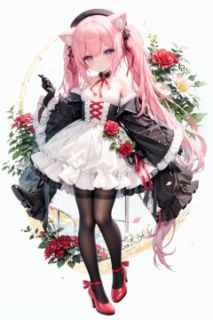 masterpiece, ((best quality)),  dynamic angle, chromatic aberration, ((colorful)),1girl, solo, flower, thighhighs, white thighhighs, gloves, red footwear, long hair, detached sleeves, animal ears, rose, blonde hair, looking at viewer, full body, hat, high heels, petals, dress, standing, twintails, wide sleeves, holding, shoes, frills, red flower, cat ears, bangs, microphone, long sleeves, white flower, hair ornament, white gloves, zettai ryouiki, bare shoulders, pink eyes, frilled dress, small breasts, breasts, closed mouth, skirt, beret, white headwear, very long hair, red eyes, red rose, white dress, blush, ribbon, black gloves, animal ear fluff, hair flower, pink flower