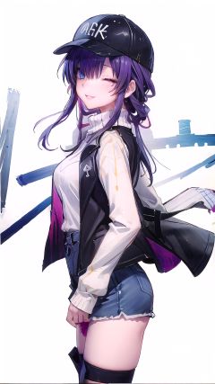 (open jacket), baseball cap, turtleneck sweater, denim shorts, black thighhighs,