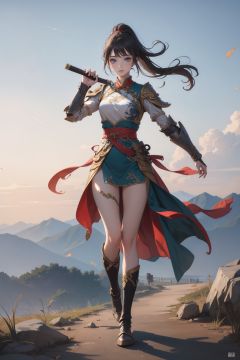 lightness,illustration,Beautiful background,battlefield,1girl,wuxia,armor, belt, chinese clothes,shoulder armor, full body,