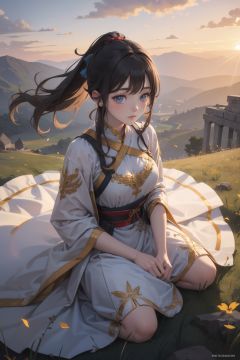 from above,lightness,illustration,Beautiful background,battlefield,1girl,Ancient costume