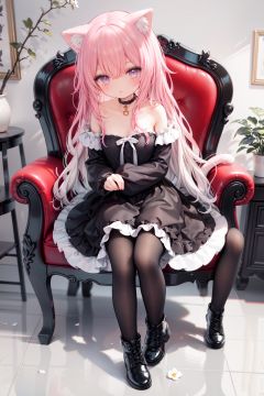 masterpiece, ((best quality)),  dynamic angle, chromatic aberration, ((colorful)),1girl, animal ears, dress, tail, solo, long hair, pantyhose, purple eyes, cat ears, cat, cat girl, cat tail, black dress, white pantyhose, standing, indoors, black footwear, animal ear fluff, looking at viewer, flower, off shoulder, full body, frilled dress, brown hair, long sleeves, blush, bangs, plant, choker, bare shoulders, potted plant, wooden floor, black choker, frills, boots, parted lips, very long hair, animal, blonde hair, chair, bow, collarbone, puffy sleeves, hair between eyes, shoes, black collar