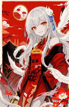 (Chinese girl:1.35),((red and yellow:0.85) but Limited palette:1.2),//,Chinese architecture,Ink,hair flowers,bamboo forest,bamboo,//(long hair),white hair,(loli),small breasts,upper body,smile,((phoenix)),fire,(makeup,red eyeliner),red eyeshadow,red eyes,(long eyelashes),half-closed eyes,peacock skirt,growth,leaf,tree,branch,peacock feathers,bare shoulders,bare legs,(chinese knot),( ink painting, ink splashes, ink wash),cloudy,cirrocumulus,mountains,lake,Chinese style architecture,(Yellow Crane Tower),chinese_trees,branch,(plum blossom),(lotus),petals,