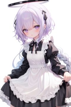 1girl,  solo,  apron,  long hair,  hair over one eye,  white background,  frills,  braid,  halo,  long sleeves,  dress,  simple background,  white hair,  white apron,  puffy sleeves,  very long hair,  frilled apron,  maid,  purple eyes,  ribbon,  parted lips,  maid apron,  bangs,  juliet sleeves,  black dress,  neck ribbon,  looking at viewer,  single braid,  blush