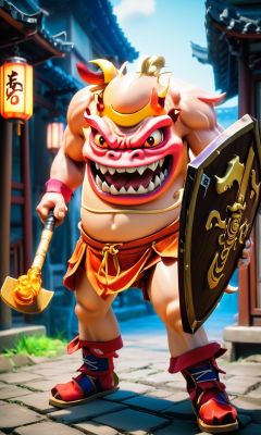 anime artwork ((masterpiece)),((best quality)),8k,high detailed,ultra-detailed,intricate detail,Photography,cute,happy expression,((xingtian wearing a straw hat)),((monster)),((headless)),((bare shoulders)),(xingtian:2),xingtian holding an axe and shield in a city street,ISO 400,F2.8 aperture,Shutter speed 1/250,ISO 400,F2.8 aperture,Shutter speed 1/250,<lora:xingtiangui:1>, . anime style, key visual, vibrant, studio anime, highly detailed