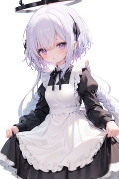1girl,  solo,  apron,  long hair,  hair over one eye,  white background,  frills,  braid,  halo,  long sleeves,  dress,  simple background,  white hair,  white apron,  puffy sleeves,  very long hair,  frilled apron,  maid,  purple eyes,  ribbon,  parted lips,  maid apron,  bangs,  juliet sleeves,  black dress,  neck ribbon,  looking at viewer,  single braid,  blush
