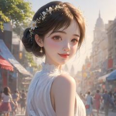 Ultra-realistic 8k CG, masterpiece, HDR, absurdres, Professional, RAW photo, studio light, a woman in a white dress  and looking at the camera with a smile on her face, 1girl, black_hair, depth_of_field, hand_fan, lips, looking_at_viewer, motion_blur, short_hair, solo, Highly detailed, Professional, extreme detail description;, (photorealistic:1.4), lens flare, (film grain:1.1), Bokeh, ((Depth of field)), bokeh, best quality
