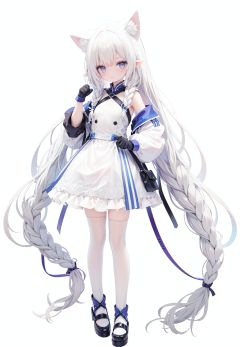 1girl, white_gloves, braid, full_body, gloves, long_hair, official_alternate_costume, pointy_ears, simple_background, solo, standing, very_long_hair, white_background,white hair,blue eyes,paw claw pose, open_mouth,