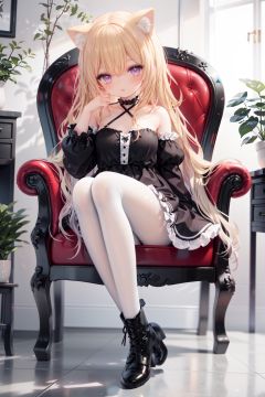 masterpiece, ((best quality)),  dynamic angle, chromatic aberration, ((colorful)),1girl, animal ears, dress, tail, solo, long hair, pantyhose, purple eyes, cat ears, cat, cat girl, cat tail, black dress, white pantyhose, standing, indoors, black footwear, animal ear fluff, looking at viewer, flower, off shoulder, full body, frilled dress, brown hair, long sleeves, blush, bangs, plant, choker, bare shoulders, potted plant, wooden floor, black choker, frills, boots, parted lips, very long hair, animal, blonde hair, chair, bow, collarbone, puffy sleeves, hair between eyes, shoes, black collar