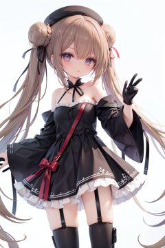 1girl, dress, double bun, hair bun, long hair, black dress, twintails, looking at viewer, smile, hat, bangs, brown hair, white background, solo, open mouth, blush, black headwear, very long hair, garter straps, thighhighs, bare shoulders, beret, :d, ribbon, black gloves, simple background, long sleeves, nail polish, black footwear, red ribbon, bow, gloves, wide sleeves, animal, hair ribbon, boots, red nails, sheath, sheathed, hair between eyes