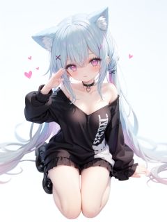 petite, loli, solo, animal ears, heart, puffy short sleeves, blue hair, long hair, off shoulder, bangs, hair ornament, gradient background,rainbow gradient, x hair ornament, animal ear fluff, looking at viewer, very long hair, blush, smile, cat ears, bare shoulders, collarbone, hand up, gradient sweater, hair between eyes, symbol-shaped pupils, arm up, heart-shaped pupils, hairclip, medium breasts, salute, bare legs,full body