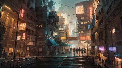 Cyberpunk Concept, scenery, stairs, building, city, sign, neon lights, railing, outdoors, air conditioner, industrial pipe, ground vehicle