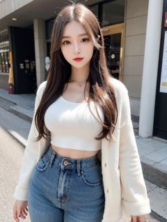 A girl about 20 years old, simple, extremely beautiful and delicate, (light makeup), brown hair, sweet smile, delicate and beautiful white skin, realistic, delicate and complete facial features, detailed facial depiction, high nose bridge, red lips, beautiful and gentle beautiful girl, fluffy and smooth hair, extremely delicate hair, soft temperament, facial touch-up, super realistic, realistic, realistic, 8K picture quality, extreme details, realistic details, master works, lifelike perfection, figure, beauty, purity, stunning beauty, peerless beauty, highest picture quality, 8k resolution, goddess, smile, fine facial features, hair over shoulder, brown hair, long and thick legs,(((high waist French jacket))),(((high waist straight jeans))), sunshine, facing the camera, well-proportioned and tight, gentle eyes, revealing thighs, standing posture, walking on the street, stockings, full body photo