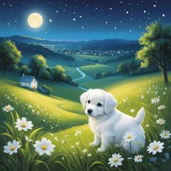 masterpiece, Village, Grassland, White flower, Fairy tale world, Fairy Tales, Puppy, Sense of reality, night, Firefly