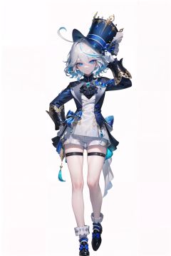8k, best quality, masterpiece, (ultra-detailed:1.1), (high detailed skin), (full body:1.2), white background, standing, hand on hip, looking at viewer, <lora:funingna-v100-000021:0.8:lbw=char>, fln, 1girl, blue eyes, gloves, hat, white shorts, blue hair, multicolored hair, ahoge, white hair, streaked hair, (white background, simple background,:1.2), (beautiful_face), ((intricate_detail)), clear face, ((finely_detailed)), fine_fabric_emphasis, ((glossy)), full_shot,