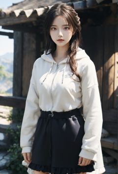 ((masterpiece)),(((best quality))),illustration,1 girl,mature female,small breast,beautiful detailed eyes,long sleeves, hoodie,frills, extremely detailed CG unity 8k wallpaper, Loong, dragon background, loong background, game cg, depth of field, Cape hood <lora:低饱和_LowSaturation【CCD系列】_v1.0:0.5>