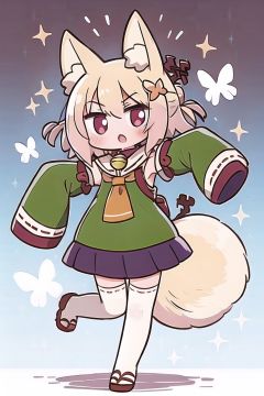 1girl, blonde_hair, fox ears, fox tail, green serafuku,loli,little girl,(chibi),(miko thighhighs),red pleated skirt,see-through, see-through silhouette,younger,petite body, baby face, round face, large face,   geta,red eyes,