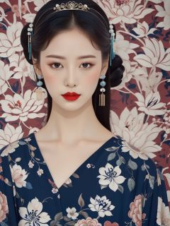 pallor,1girl,black hair,chinese clothes,floral background,floral print,flower hair,ornament,lily \(flower\),portrait,red lips,simple background,solo,white flower,