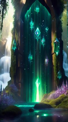 (Magic Universe, Fantasy Style :1.5) (Intricate detail) (Advanced color) (Science Fiction concept Light) On your way deep into the forest, you discover a huge crystal waterfall whose water is emerald green and emits an intoxicating floral scent. As you get closer, you see that behind the crystal waterfall lies a door to another dimension. The door is set with glittering gems, each representing a different world