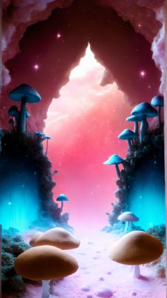 (Magic Universe, Fantasy Style :1.5) (Complex Detail) (Advanced Color) (Science Fiction Concept Light) You decide to walk through this door and arrive at a strange world completely different. The sky of this world is pink, and the clouds are twinkling crystals floating in the sky. The ground is soft pink sand, and the sand is filled with colorful giant mushrooms, each with its own emotions and thoughts