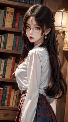 book,1girl,plaid,glasses,holding_book,plaid_skirt,bookshelf,solo,library,skirt,long_hair,looking_at_viewer,long_sleeves,holding,school_uniform,adjusting_eyewear,semi-rimless_eyewear,Ethnic Clothing