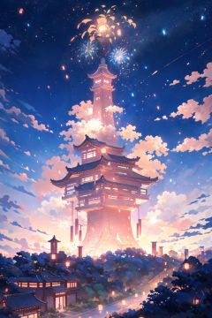 (The Kongming Lantern in the sky is from far to near:1.2), with fireworks blooming in the distance, (night view of Chang'an City:1.3), brightly lit streets, warm lighting, and a panoramic view of high quality, 8k